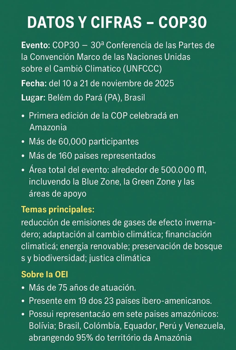 Como parcera del Gobierno brasileño en la organización del evento, la Organización de Estados Iberoamericanos para la Educación, la Ciencia y la Cultura (OEI) desempeña un papel estratégico en la conferencia, siendo responsable de una parte significativa de la logística, la infraestructura y el apoyo a eventos paralelos, además de garantizar que los procedimientos y prácticas del encuentro estén alineados con las normas internacionales, asegurando que la COP30 se realice conforme a las mejores prácticas ambientales, sociales y éticas.
