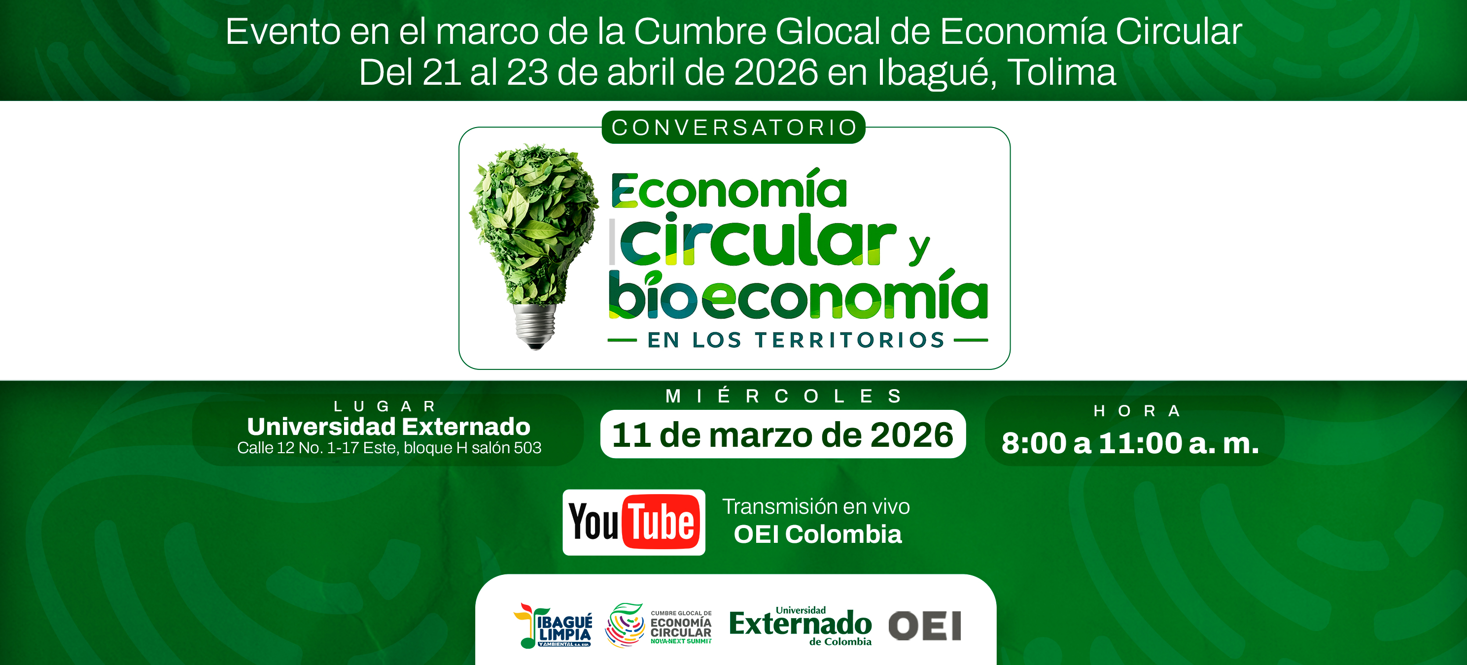 El próximo 11 de marzo, la Organización de Estados Iberoamericanos para la Educación, la Ciencia y la Cultura (OEI), en alianza con la empresa de servicios públicos Ibagué Limpia y Ambiental, y con el apoyo de la Universidad Externado de Colombia, realizará el conversatorio “Economía circular y bioeconomía en los territorios: capacidades, CTI y gobernanza para escalar soluciones locales”, un espacio estratégico de diálogo orientado a fortalecer la articulación entre territorio, academia, empresa y cooperación internacional.