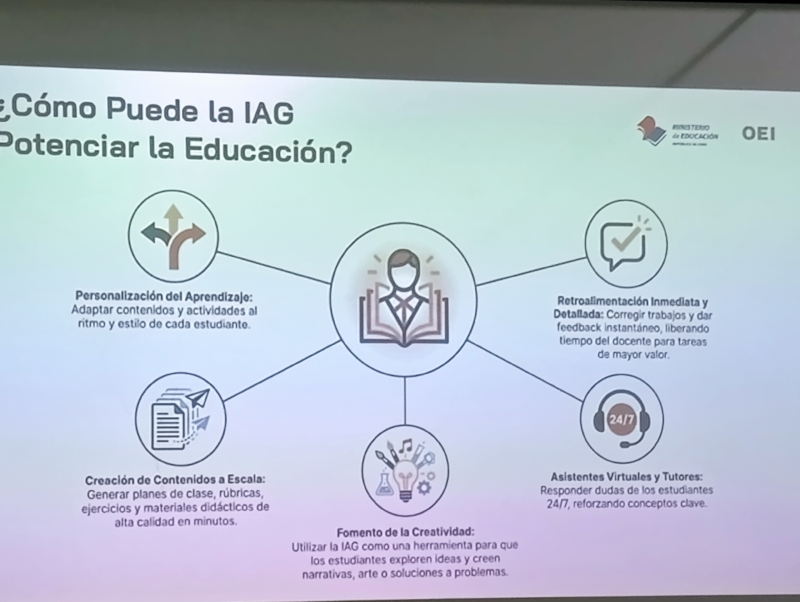 La técnica de proyecto de la OEI, Dr. C. Arahy Martín, destacó que el verdadero desafío no es simplemente usar la inteligencia artificial, sino hacerlo con sentido pedagógico y humano, recordando que educar con tecnología es educar para la vida y que la IA no sustituye al docente, sino que lo potencia.