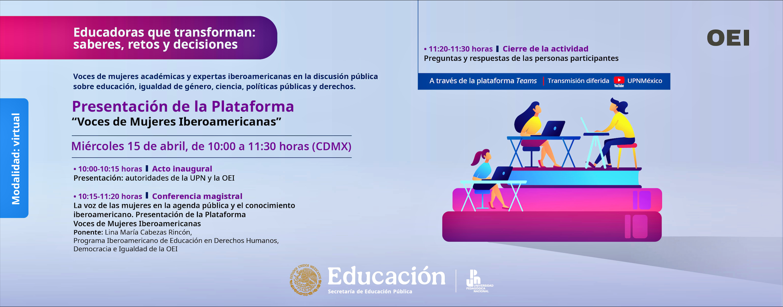 La Universidad Pedagógica Nacional (UPN-Ajusco), en coordinación con la Organización de Estados Iberoamericanos para la Educación, la Ciencia y la Cultura (OEI) realizan el ciclo de conferencias “Educadoras que transforman: Saberes, retos y decisiones” con el objetivo de visibilizar y posicionar las voces de mujeres académicas y expertas iberoamericanas en la discusión pública sobre educación, igualdad de género, ciencia, políticas públicas y derechos.