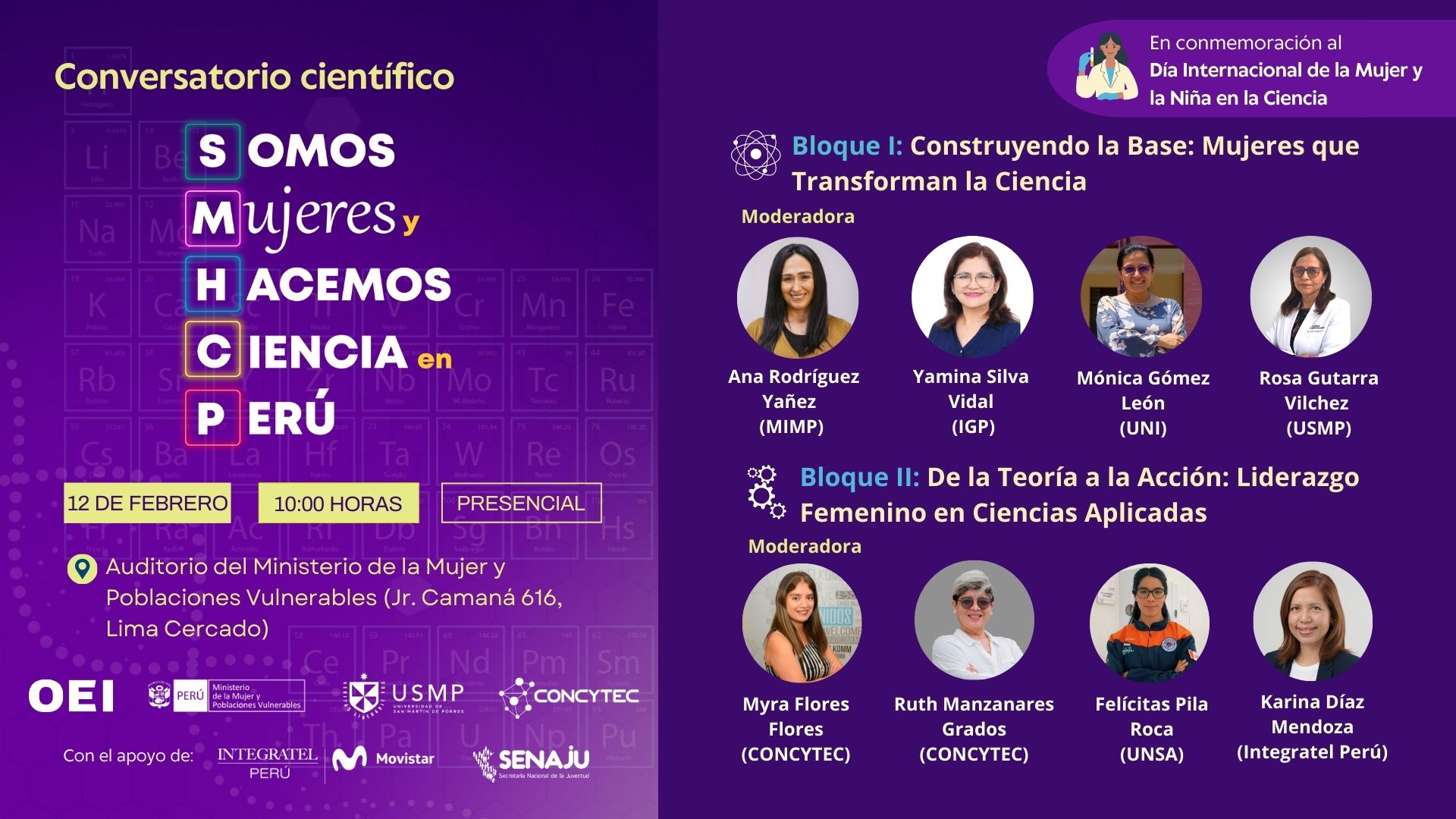 En ese marco, el programa científico Somos Mujeres y Hacemos Ciencia en Perú, liderado por la Organización de Estados Iberoamericanos (OEI) junto a la Universidad de San Martín de Porres (USMP), y con el apoyo del Ministerio de la Mujer y Poblaciones Vulnerables (MIMP) y del Consejo Nacional de Ciencia, Tecnología e Innovación (CONCYTEC), realizará el Segundo Conversatorio “Somos Mujeres y Hacemos Ciencia en Perú” con el apoyo de la Secretaría Nacional de la Juventud (SENAJU) e Integratel Perú – Movistar, en conmemoración del Día Internacional de la Mujer y la Niña en la Ciencia.