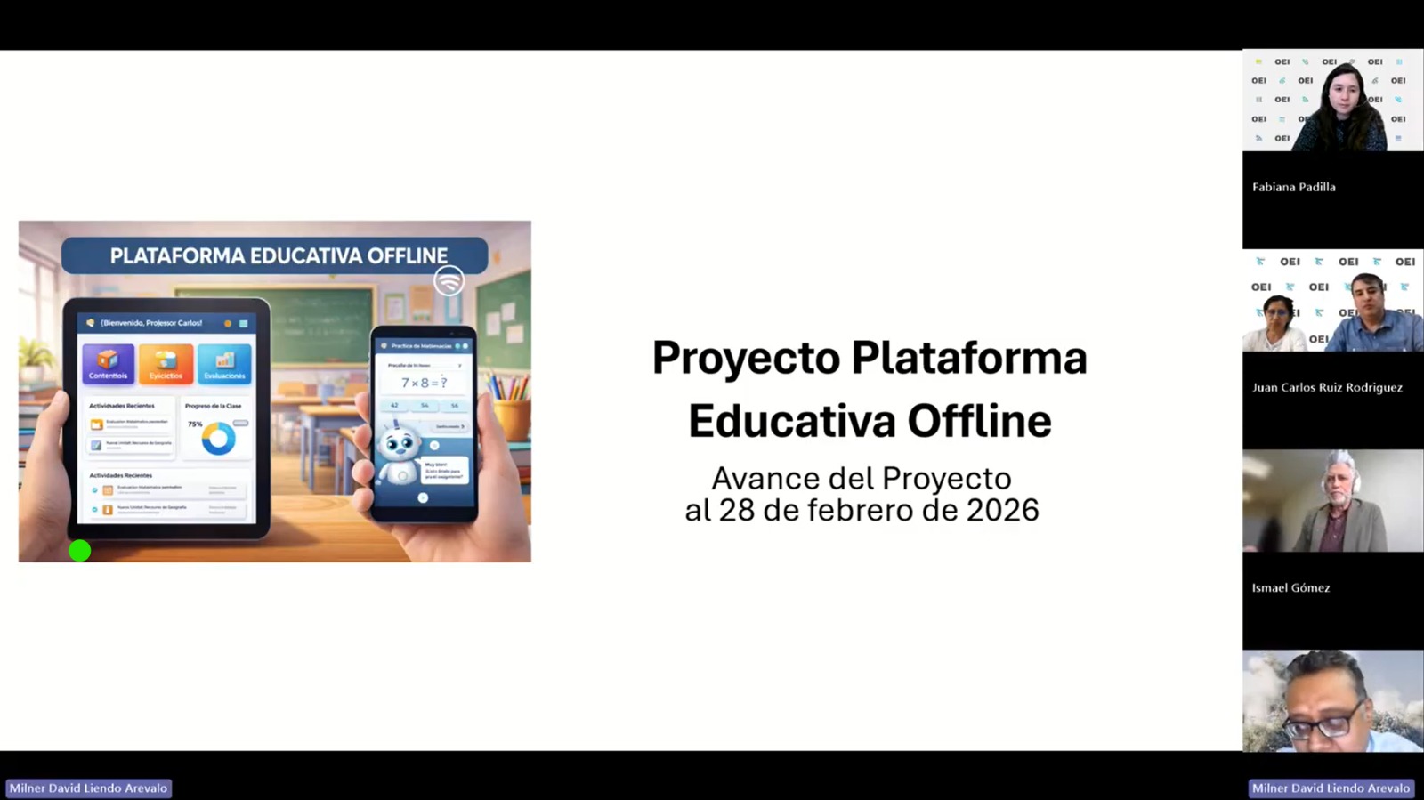 En coordinación con el DITE del Ministerio de Educación y la OEI, se desarrolló una reunión de trabajo para revisar los avances del proyecto Plataforma Offline, iniciativa presentada al fondo concursable impulsado por la OEI. El encuentro contó con la participación de Ismael Gómez, jefe de Estrategia Digital Global de la OEI; Milner Liendo Arévalo, gestor del proyecto; y Jesús Muñoz Alegre, representante del MINEDU.