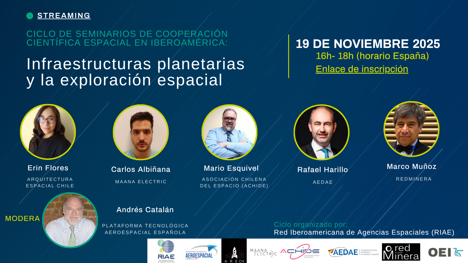 El webinar es organizado por la Red Iberoamericana de Agencias Espaciales y la Plataforma Aeroespacial Española (PAE), Asociación Chilena del Espacio (ACHIDE), la Asociación Española de Derecho Aeronáutico y Espacial (AEDAE) y EuroPlanet Society