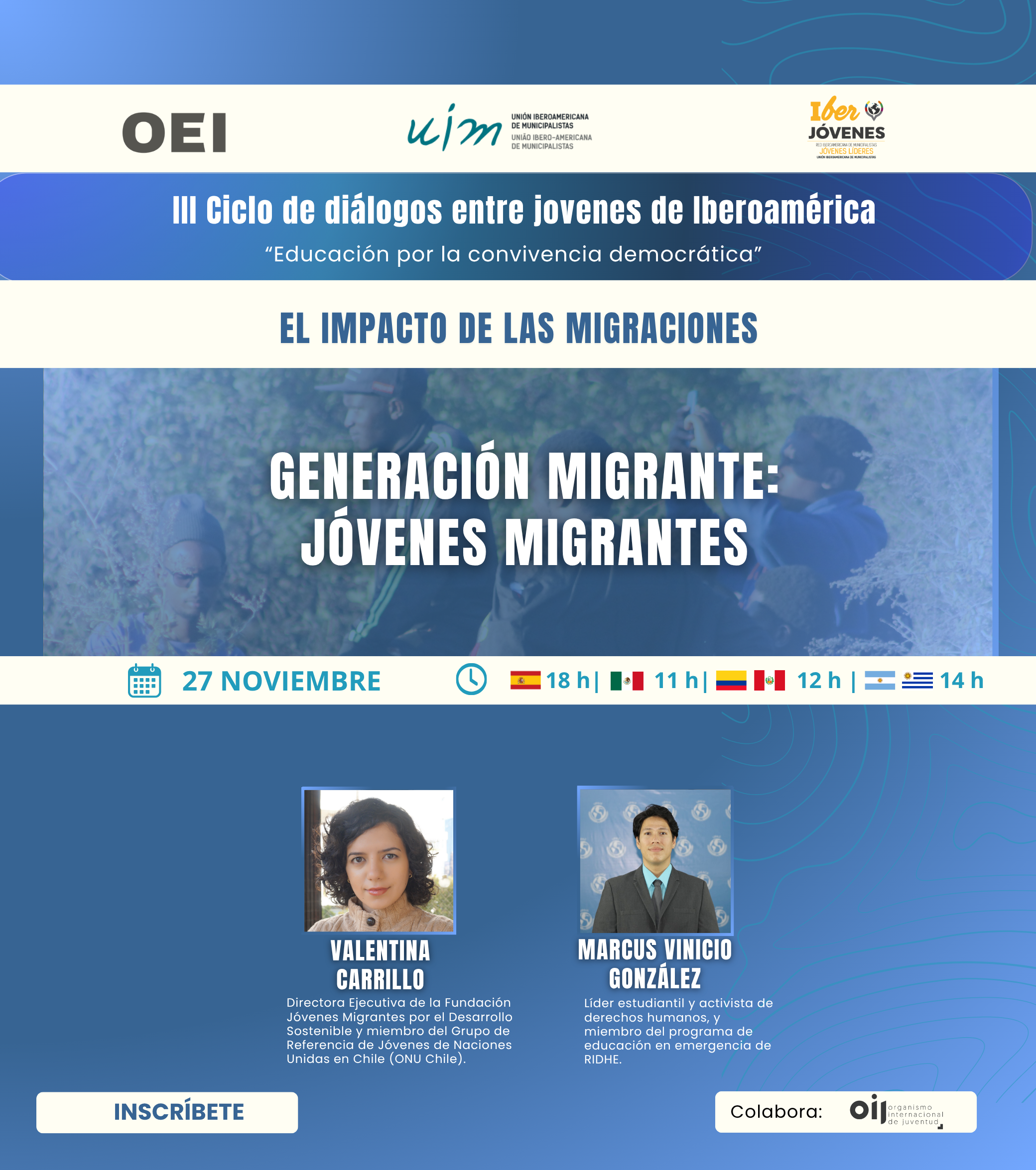 18:03h.- 18:20h. Diálogo entre jóvenes migrantes invitados, Valentina Carrillo Directora de la Fundación Jóvenes Migrantes por el Desarrollo Sostenible y miembro del Grupo de Referencia de Jóvenes de Naciones Unidas en Chile (ONU Chile), y Marcus Vinicio González, Líder estudiantil y activista de derechos humanos, y miembro del programa de educación en emergencia de RIDHE – Alejandra Hernández (OEI) introductorio del tema tipo diálogo y lanzamiento de preguntas disparadoras.