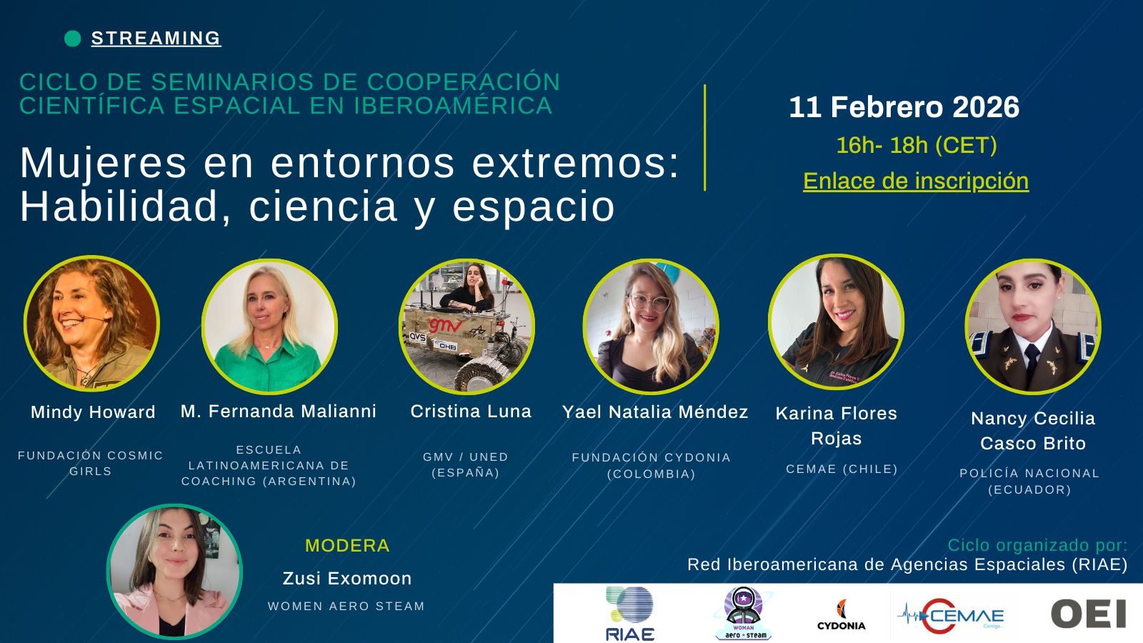 Este seminario contará con la participación de mujeres expertas de alto nivel de Argentina, Chile, Colombia, Ecuador y España quienes generarán un intercambio de conocimiento multidisciplinar para abordar los retos actuales y futuros de la exploración espacial desde la ingeniería, la medicina aeroespacial, los ambientes similares y la habitabilidad espacial.